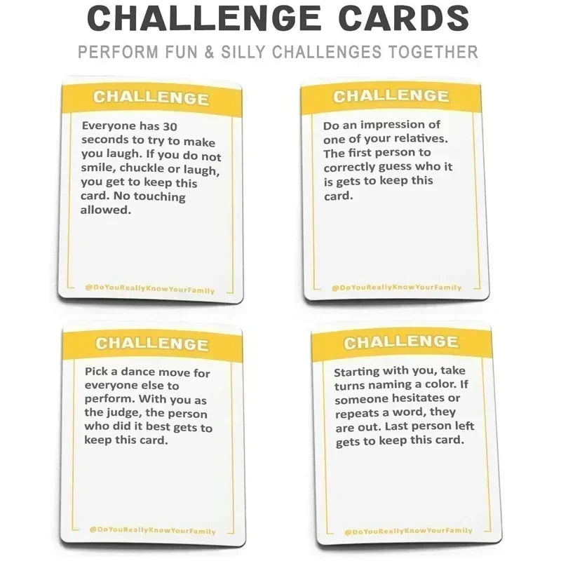 Take turns drawing Trivia Cards and sharing the questions about yourselves out loud. The first person to correctly guess the answer wins the card! Challenge Cards have quirky and playful challenges and games for the whole family to do together. Complete the challenge and earn another card! Share the laughs as everyone learns new things about each other! "Do You Really Know Your Family?" is the perfect addition to any family game night or party.